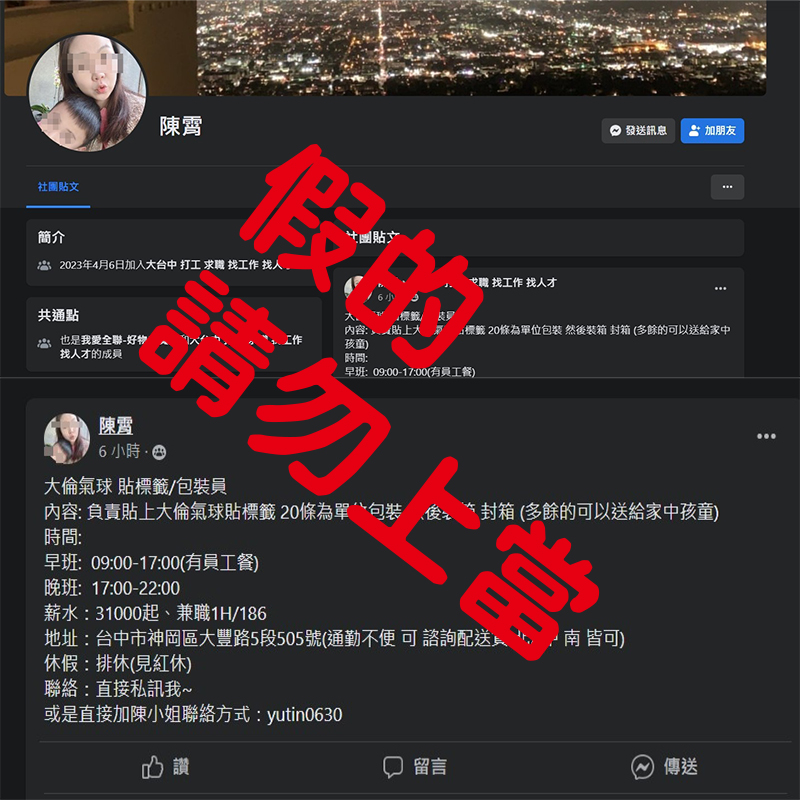 公司目前"沒有"在任何臉書社團上徵人沒有徵人!!!沒有徵人!!!沒有徵人!!!請大家留意~假冒大倫氣球公司地址&求職資訊~如果私訊或要求你加line ID~要求你傳什麼個人資料的~請多加小心~求職詐騙!以免上當受騙!假的~假的~假的!!!!謝謝大家!